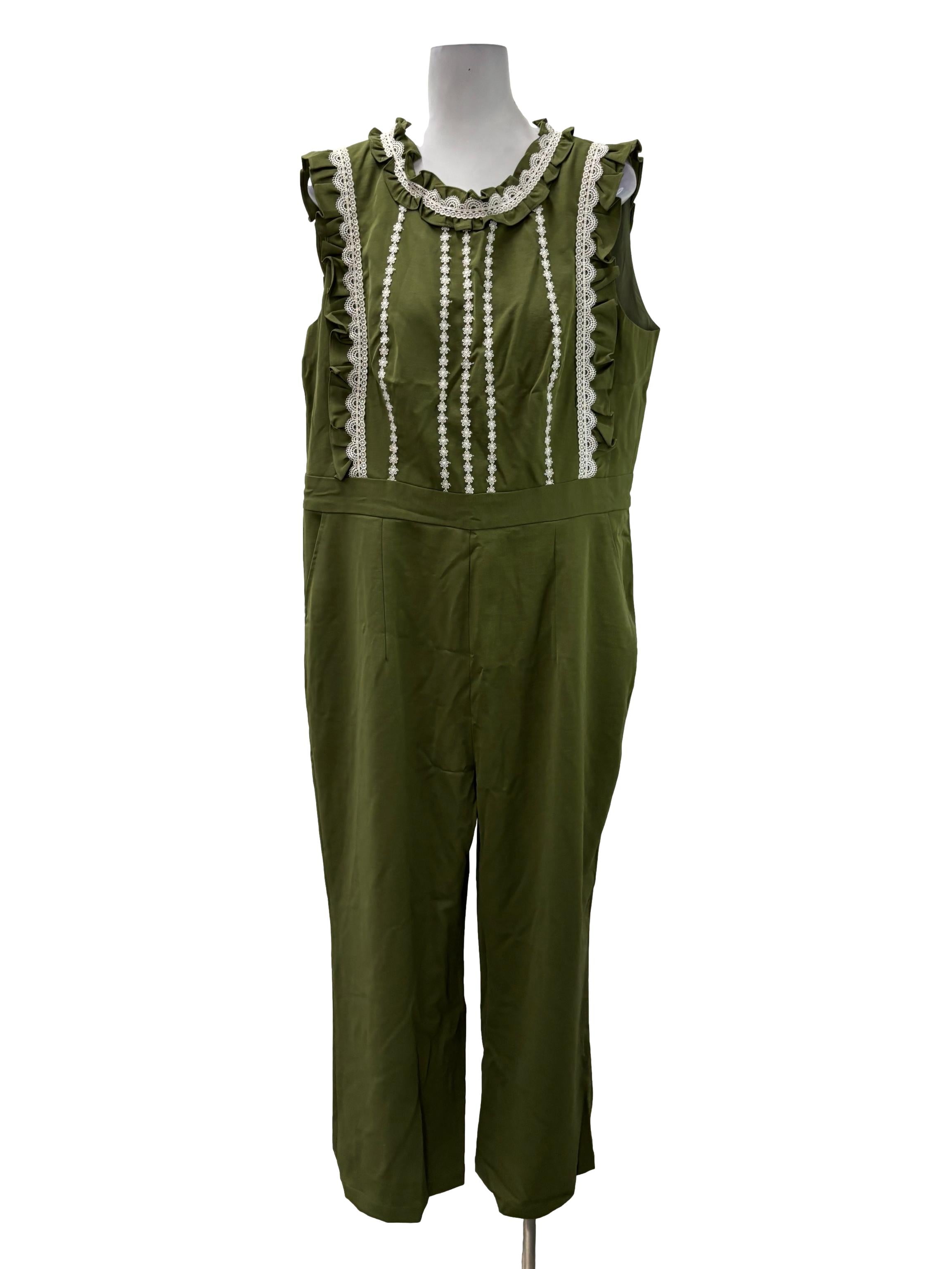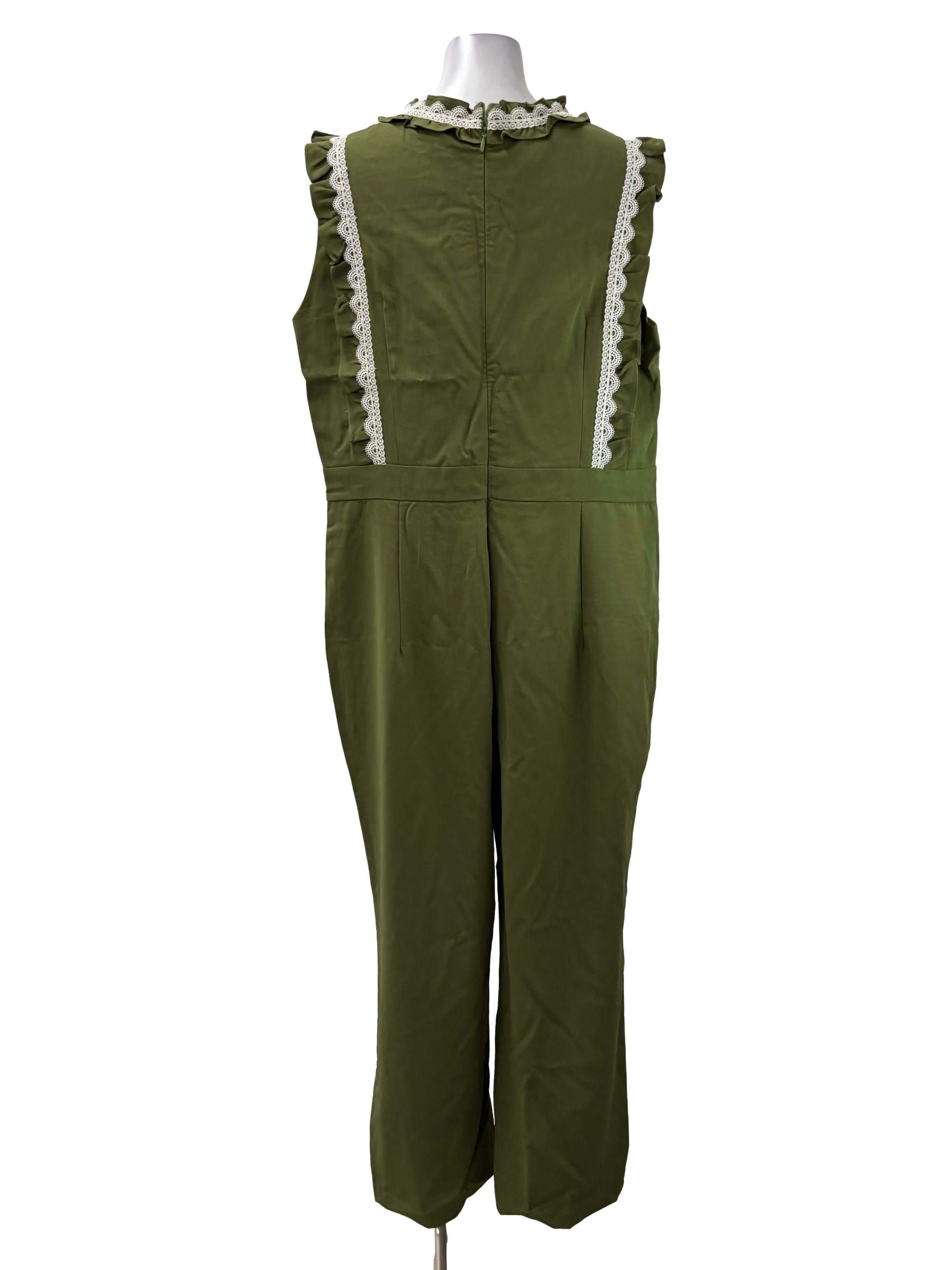 Army Green Roundneck Lace Trim Sleeveless Jumpsuit