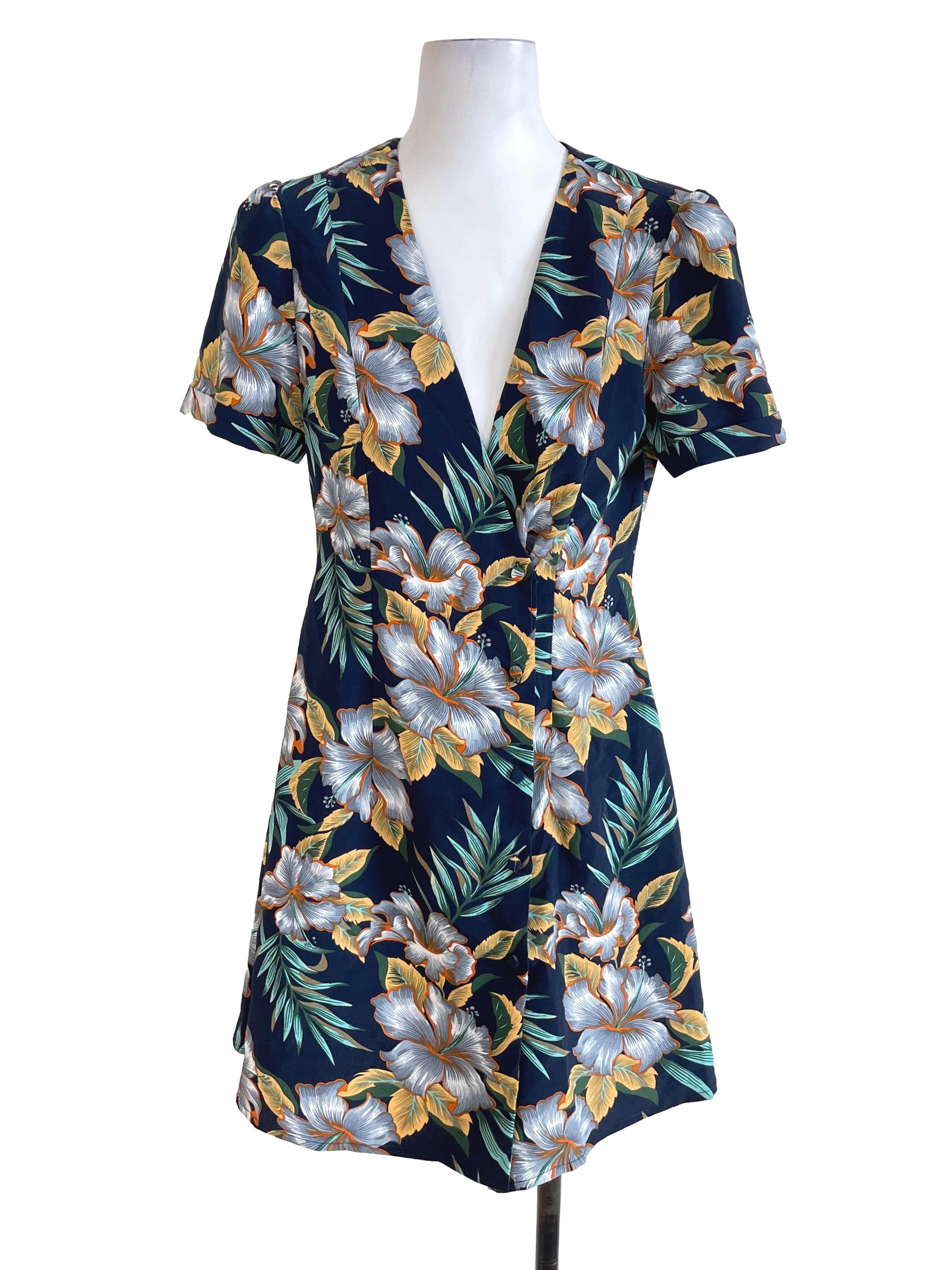 Navy Blue Tropical Print Shirt Dress
